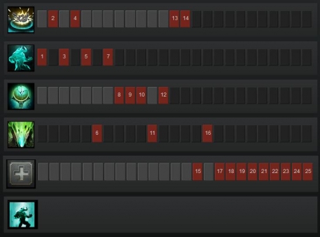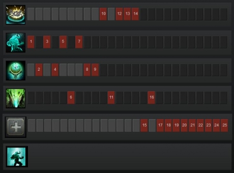 The second build is one that was pioneered in competitive Dota. Natural Order is a ridiculously strong ability, and once you realise this it becomes understandable why professional players often don’t skill Echo Stomp early on at all (a 0/4/4/1 build, as shown in the image below). This is my preferred build personally, but is not one I would recommend to newer players; you get the incredible power of Natural Order on line early, but it is achieved by giving up the ability to Stomp into Earth Splitter early on.