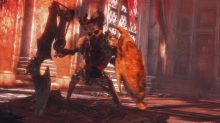 There are three main ways of dealing with these enemies. The first and simplest is to jump over their heads and quickly come down behind them with an attack like the Helmbreaker. Once you have the Arbiter or Eryx weapons, you can hit them through their shield or even break it, allowing for much simpler combat. In some instances with much faster enemies in the mix, it's easier to just fight them without the heavier weapons. To do this, use the Ophion Demon Pull to yank them forward and break their guard, allowing you to get inside and hit them hard and fast.