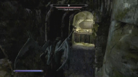 This room is quite dangerous with numerous vampires in it. If you are trying to play as the Vampire Lord in this room, remember that if you run out of magicka, you can land and attack with melee. If you kill an enemy with a power melee attack, you will kill them by feeding which will restore some health. If the enemies give you trouble, particularly as the Vampire Lord, lead them back down the stairs and over the pressure plates to make quick work of them.