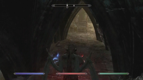 Go up the stairs here and you'll enter a room with lots of spider webs. A Gargoyle or two will attack you in this room. Continue south and go through the door there. Go up the next set of stairs and kill the two Skeletons there. Go up the large set of stairs to an area with another Gargoyle. Kill the Gargoyle and then turn around so that you are facing ENE. Go under the ruins and up the stairs.