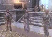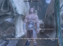 You are now in Sovngarde (Asgard), the land of valiant dead. Your goal is to make it across this foggy valley to the Hall on the far side. Along the way, you may bump into a few old friends who have died depending on any of the other quests you may have accomplished. About half way across the valley, you will come to a rather large hill that you can use to get yourself situated. Keep moving and when you get close, you will meet Tsun. You must defeat him to get to the Hall. He will use two-handed combat and can hit pretty hard but otherwise, he is fairly simple. Take him down, cross the bridge and enter the Hall. Here, you will meet up with the three heroes from your visit to the past and you will all set out to slay Alduin.