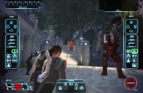 Mass Effect's combat plays out like that of a third-person shooter. At most points, you have two teammates with you (chosen from the six potential teammates). You can pause the game at any point to use your own abilities or instruct your teammates to use theirs. Abilities operate on individual cooldowns.
