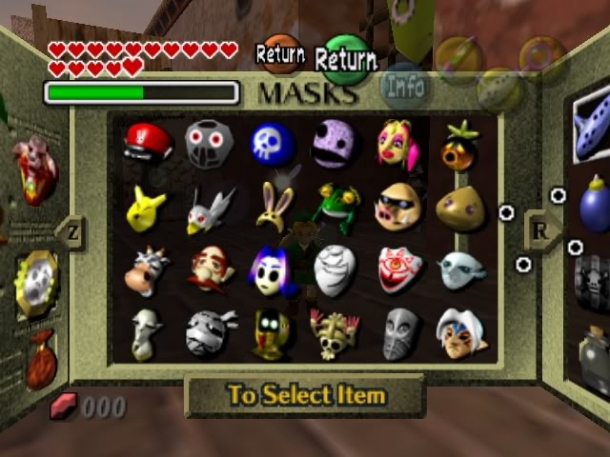 Postman's Hat All-Night Mask Blast Mask Stone Mask Great Fairy Mask Deku Mask Keaton Mask Bremen Mask Bunny Hood Don Gero Mask Mask of Scents Goron Mask