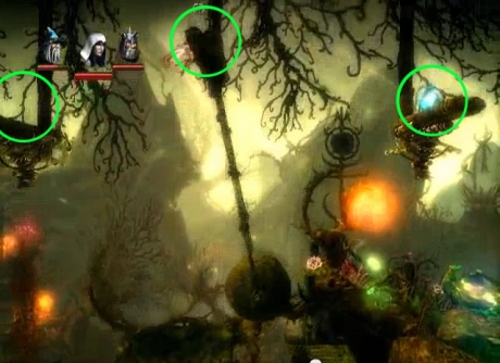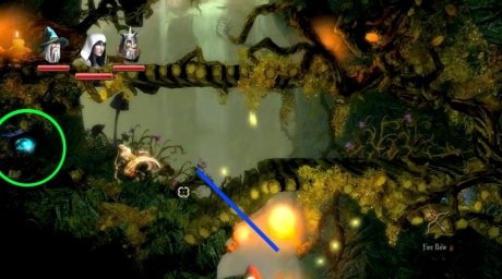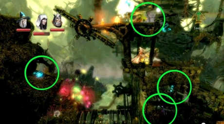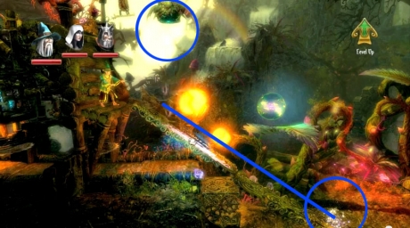 There is Level Experience x2 blocked by wooden beams to the upper right and upper left and another Level Experience x7 past the flames. Using Amadeus, block the two horizontal flames to safely get across and make sure to shoot down the large potion above.