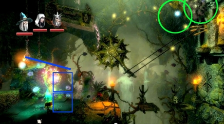Back at the saw, look right and spot another Level Experience x2 in some crates above the saws to the right. Using Amadeus, move them into the saws and then jump on the conveyor and collect them safely. Head back up and continue right and when you see the water plant create a plank to the wooden platform holding it. You can now create a plank/box to grab the Level Experience x3 in the sky and drop to the checkpoint.