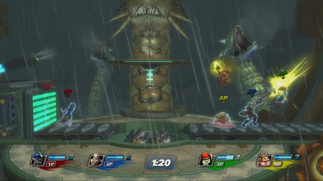 After the match has been going on for a little bit, heavy rain will appear and the Hydra from God of War will appear. The Hydra attacks the stage and players by snapping at them with its jaws, as well as slamming its heads on the stage. When the Hydra appears, Qwark is knocked into the water, but towards the end of the match, he reappears and rides off on one of the Hydra heads.