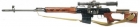 The real Dragunov is called SVD and is manufactured by Izhmash, Soviet Union (now Russia) and was first designed in 1963. It fires NATO 7,62mm rounds, weights 4,3kg and has a range up to 600m. The SVD has been heavily produced and is used in many countries around the world, especially in former Warsaw Pact states, Latin America, Middle and East Asia. It equips the PSO-1 scope.