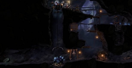 Continue to the right and remove the character from the rope so you can pull the box left, just between the gap above. The fall is normally too far for your characters, but with the box now in place they can carefully fall to safety. Move all three characters on the weighted floor lever and continue.