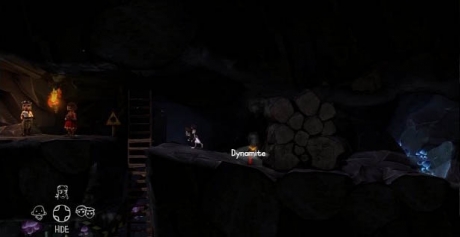 Climb out of the water to your right and head down the ladders to the Box of Dynamite and grab a stick. Now head back up the ladder and light the Dynamite via the Flame and rush over to the right and toss it by the rocks.