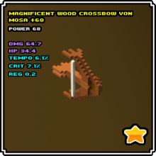 The Crossbow is a weapon usable by the Ranger class, it has a slow attack rate and does high damage. Hits regain MP, its special attack shoots a stronger arrow with area of effect damage and the possibility to stun (uses MP).