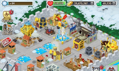 In Knights & Dragons, players are tasked with rebuilding the castle which is in shambles. The player must gather resources to rebuild and construct buildings to access new features and level up, collecting funds from the money making structures. There are quests available as well as combat missions through dungeons where the player will earn experience points.