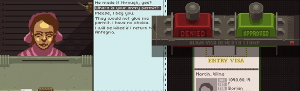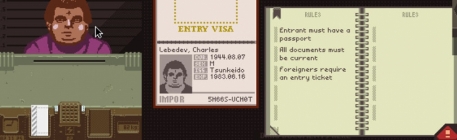 The player inspects would-be immigrants' documents and uses a sparse array of tools to determine whether the papers are in order for the purpose of keeping spies, smugglers and other unwanted individuals out of the country. When discrepancies are discovered, the player can interrogate the applicant about the discrepancy and demand further information, such as fingerprints or a full body scan. If further discrepancies are discovered, the player can have the applicant detained, or the applicant can attempt to bribe the inspector.