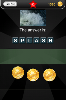 The answer to level 82 in What's that Pic - Searchlight is SPLASH.