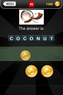 The answer to level 85 in What's that Pic - Searchlight is COCONUT.