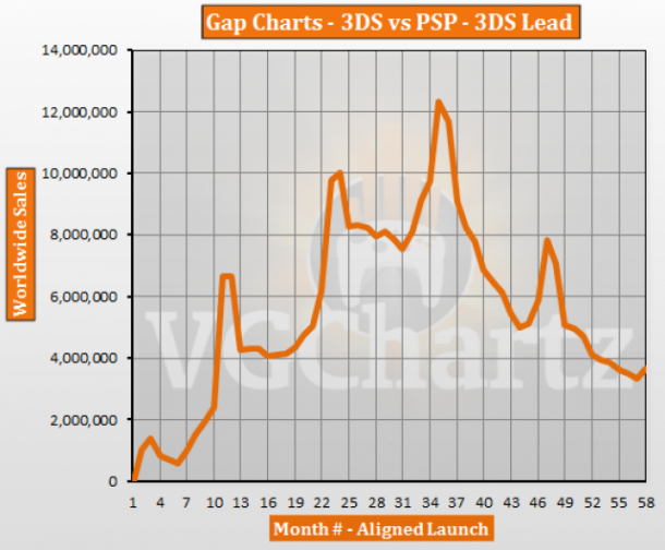 3DS Vs. PSP Global: Gap change in latest month: 319,884 – 3DS Gap change over last 12 months: 2,233,563 – PSP Total Lead: 3,650,502 – 3DS 3DS Total Sales: 55,890,684 PSP Total Sales: 52,240,182