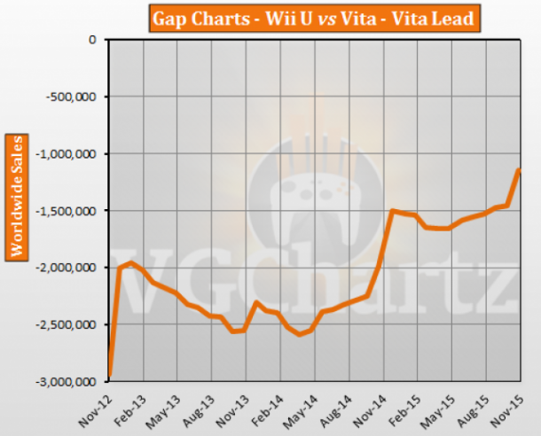 Wii U Vs. PlayStation Vita Global: Gap change in latest month: 308,566 – Wii U Gap change over last 12 months: 841,668 – Wii U Total Lead: 1,143,112 – PSV Wii U Total Sales: 11,243,204 PSV Total Sales: 12,386,316