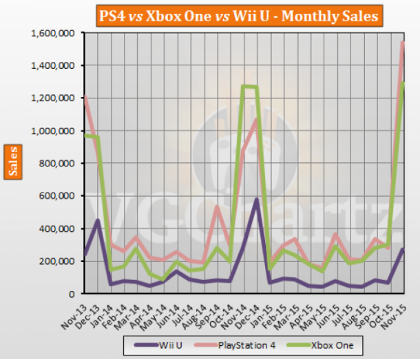 The PlayStation 4 and Xbox One have both outsold the Wii U every month in the US since they released in November 2013. After being outsold last month, the PlayStation 4 outsold the Xbox One in November. The PlayStation 4 outsold the Xbox One by 243,804...