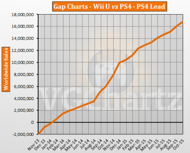 PS4 Vs. Wii U Global: Gap change in latest month: 766,822 – PS4 Gap change over last 12 months: 10,818,429 – PS4 Total Lead: 16,827,023 – PS4 PS4 Total Sales: 27,541,622 Wii U Total Sales: 10,714,599
