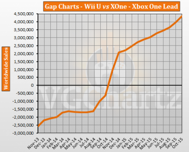 XOne Vs. Wii U Global: Gap change in latest month: 398,392 – Xbox One Gap change over last 12 months: 5,013,890 – Xbox One Total Lead: 4,373,552 – Xbox One Xbox One Total Sales: 15,088,152 Wii U Total Sales: 10,714,599